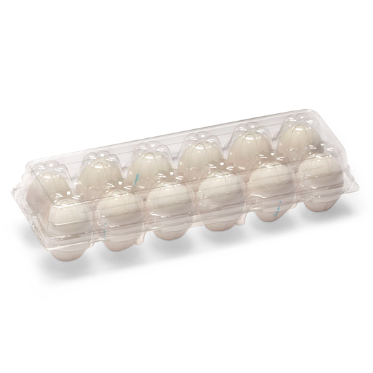 CHAROLA TERMOFORMADA EN PET (GRADO ALIMENTICIO) PARA DOCENA DE HUEVOS, BRINDANDO PROTECCIÓN, PRESENTACIÓN Y POSIBILIDAD DE APILAR DENTRO DEL ALMACENAJE PARA OPTIMIZAR ESPACIOS.